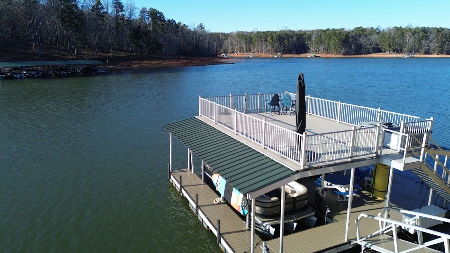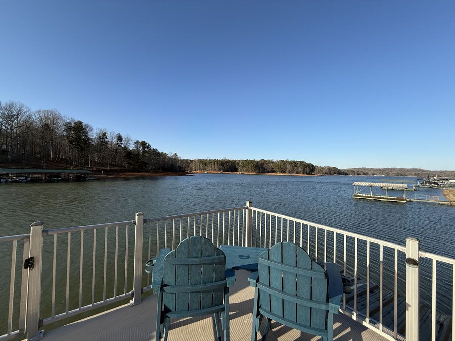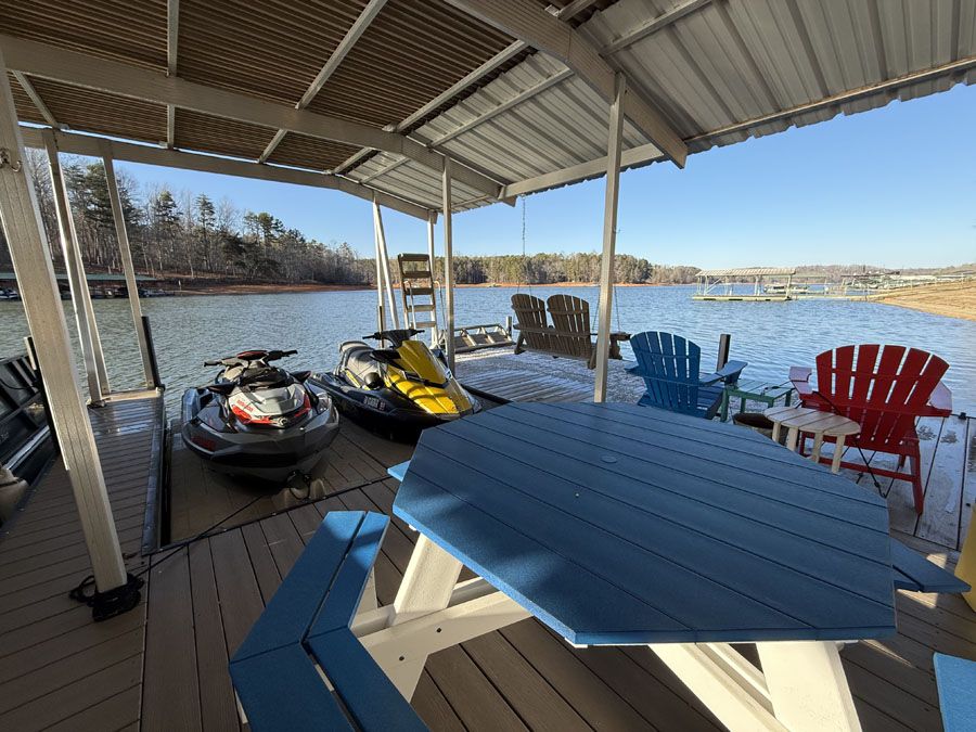 This great Lake Hartwell home is located just 10 minutes from I-85 in a protected neighborhood with beautiful homes. As you enter the great room through the front door, the lake opens up in front of you. The great room is open to the kitchen, dining area, and a separate wet bar. There are two lakefront bedrooms with baths on this level, and both bedrooms and the great room have doors to the deck spanning the width of the house. The terrace level has a gigantic rec room big enough for a TV area, pool table, and arcade games. There is a second wet bar on this level, along with a large sunroom that could be used as an office, an exercise area, or for additional sleeping. You will find two more bedrooms and another full bath on this level. The laundry room is here also, with a laundry chute from the master suite above. There are also two handy storage rooms. A concrete path leads to the max size dock with an upper deck. The lower level of the dock is configured with a boat slip and two PWC ports, but can easily be changed to accommodate two boats if you prefer. This property includes covered parking for one car or boat and plenty of open parking in the paved parking area. All furnishings are included in the sale.